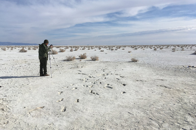 | General view of Alkali Flat at White Sands National Monument (New Mexico) showing a series of excavated footprints in the foreground |