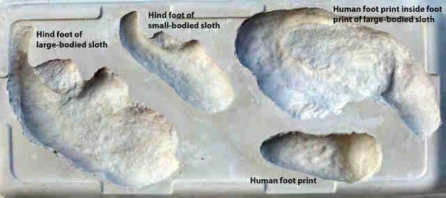 | Human footprint inside a sloth track. This composite track is part of a trackway in which the human appears to have stalked the sloth |