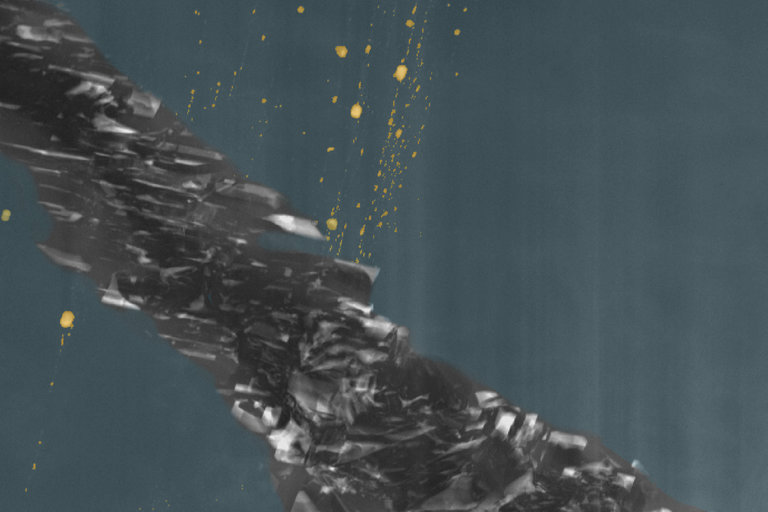 | Colorized STEM image showing the diamond phase (blue), inclusions (yellow), and the graphite region (grey). |